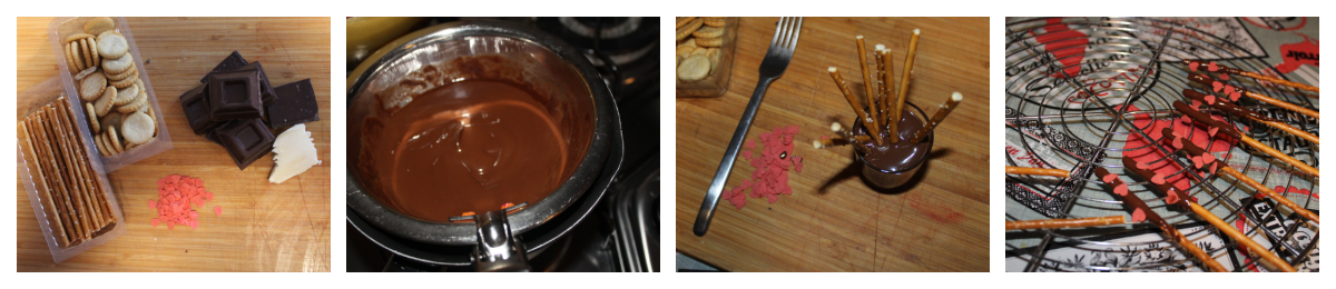 Intingete per metà gli stick salati, adagiateli su una griglia e cospargeteli di zuccherini, lasciate che il cioccolato si rapprenda.