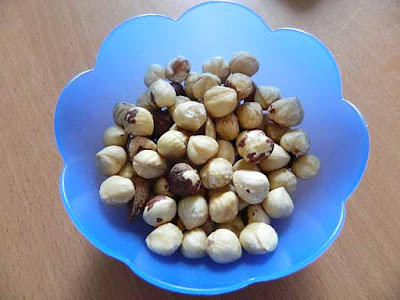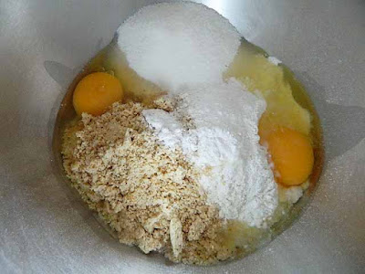 In una ciotola capiente mettere la farina, le nocciole ridotte in polvere, lo zucchero, le uova, la vanillina, il lievito e per ultimo il burro,