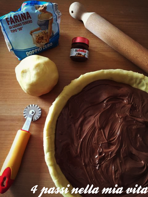Riempiamo con la Nutella (se è troppo dura ammorbidiamola facendo bollire per qualche minuto il vasetto in un pentolino con acqua) e con la rimanente pasta frolla creiamo le classiche strisce per decorare la crostata.