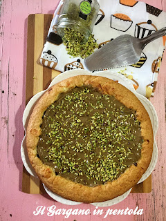 Una volta cotta lasciamo raffreddare completamente, dopodichè copriamo con la crema di pistacchio e decoriamo con la granella.