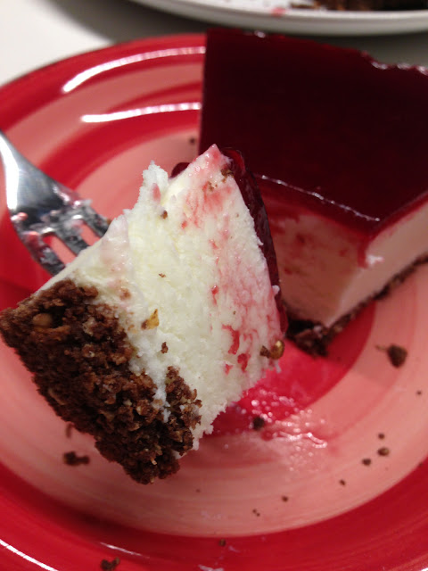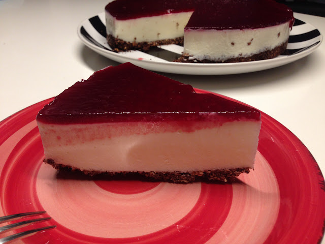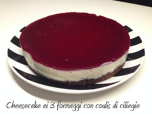Sebbene l’estate non abbia ancora preso completamente piede, in casa Clemé&Calabrè si è già fatto lo switch ai piatti estivi…due su tutti: Polpettone di tonno e cheesecake, in tutte le sue versioni. Oggi vi parlo di una versione sperimentale: la 3 formaggi con coulis di ciliegie. Il bello di questo dolce è che si presta ad un numero pressochè infinito di versioni, giocando sui suoi tre elementi: base, farcia, topping. Sia dolce che salata la cheesecake è un dolce fresco, veloce e comodo da preparare, sfruttando i riposi in freezer. Ho da poco cambiato azienda e non appena si è sparsa la voce della mia passione mi hanno chiesto una dimostrazione (sti malfidati…hihihi). Per me altro non è stata che un’occasione per testare una versione diversa. Per la base biscotti al cioccolato e cereali; per la farcia yogurt, spalmabile e ricotta, coulis di ciliegie per la copertura. Eccola…