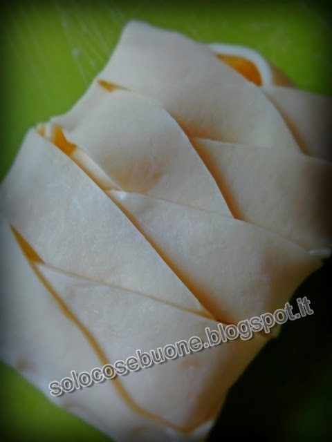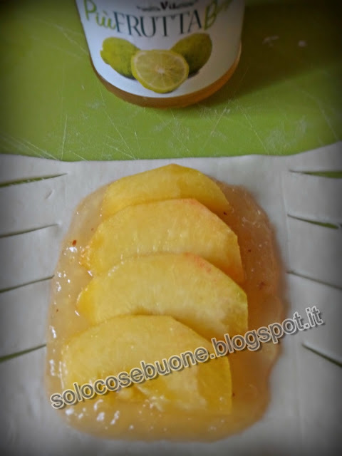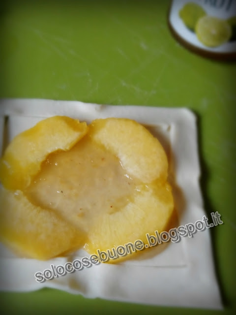 Per realizzare queste sfiziose sfoglie farcite, occorre ritagliare dei rettangoli della grandezza desiderata, fare dei tagli laterali ed adagiare nel mezzo della confettura dei pezzi di pesca e incrociare le alette di sfoglia laterali.