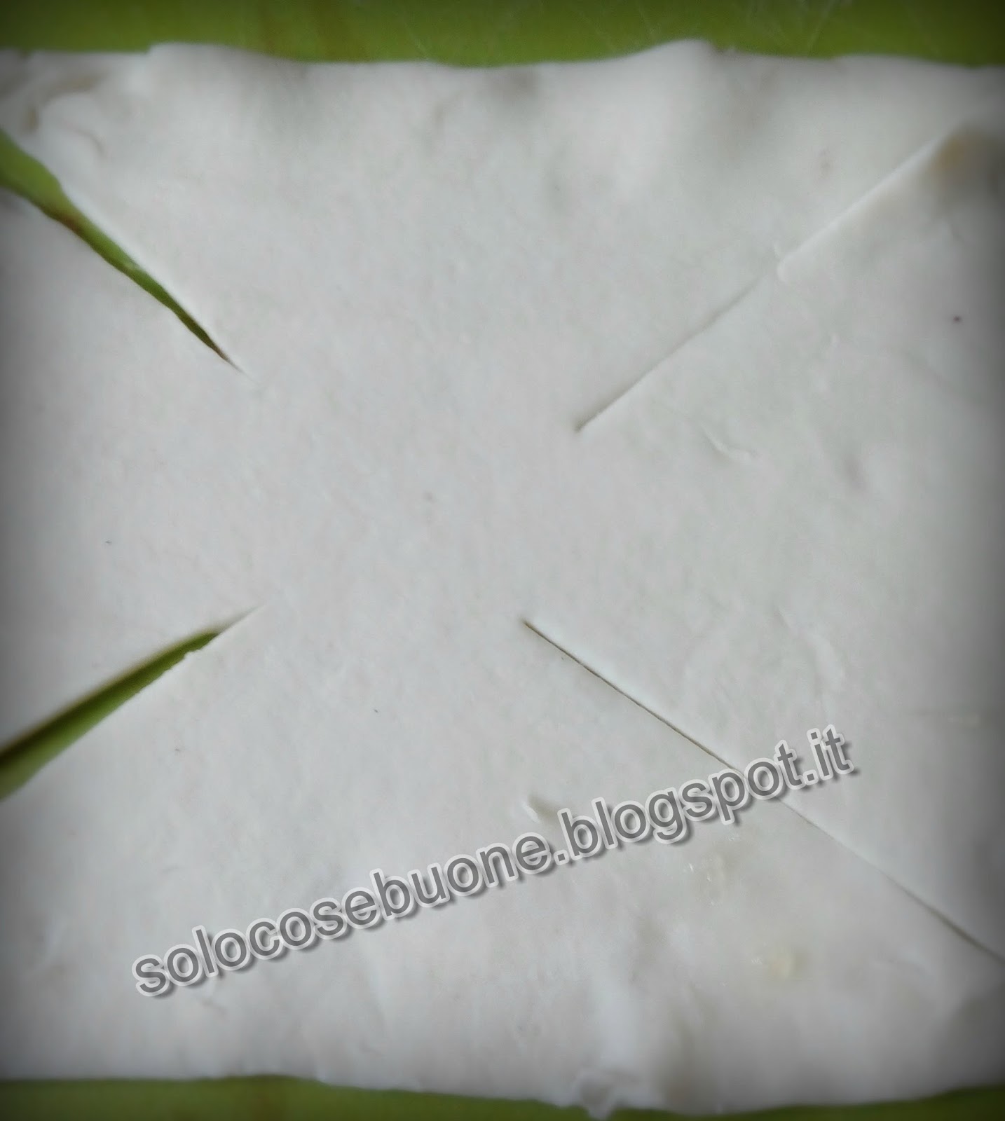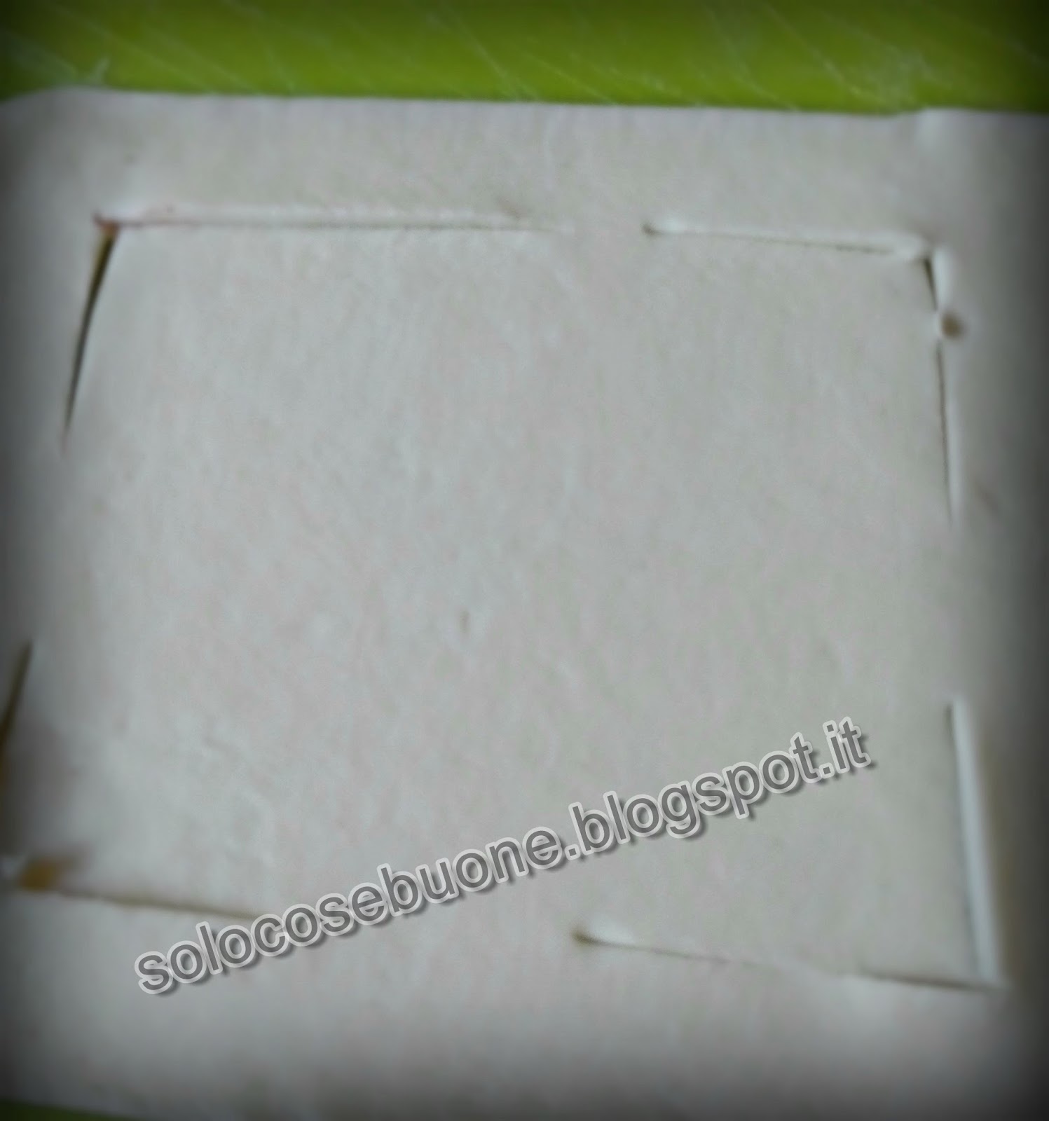 Ritagliamo questa volta dei quadrati dalla sfoglia. Incidiamo una cornice tutto intorno lasciando solo a metà del lato dei tratti non incisi.