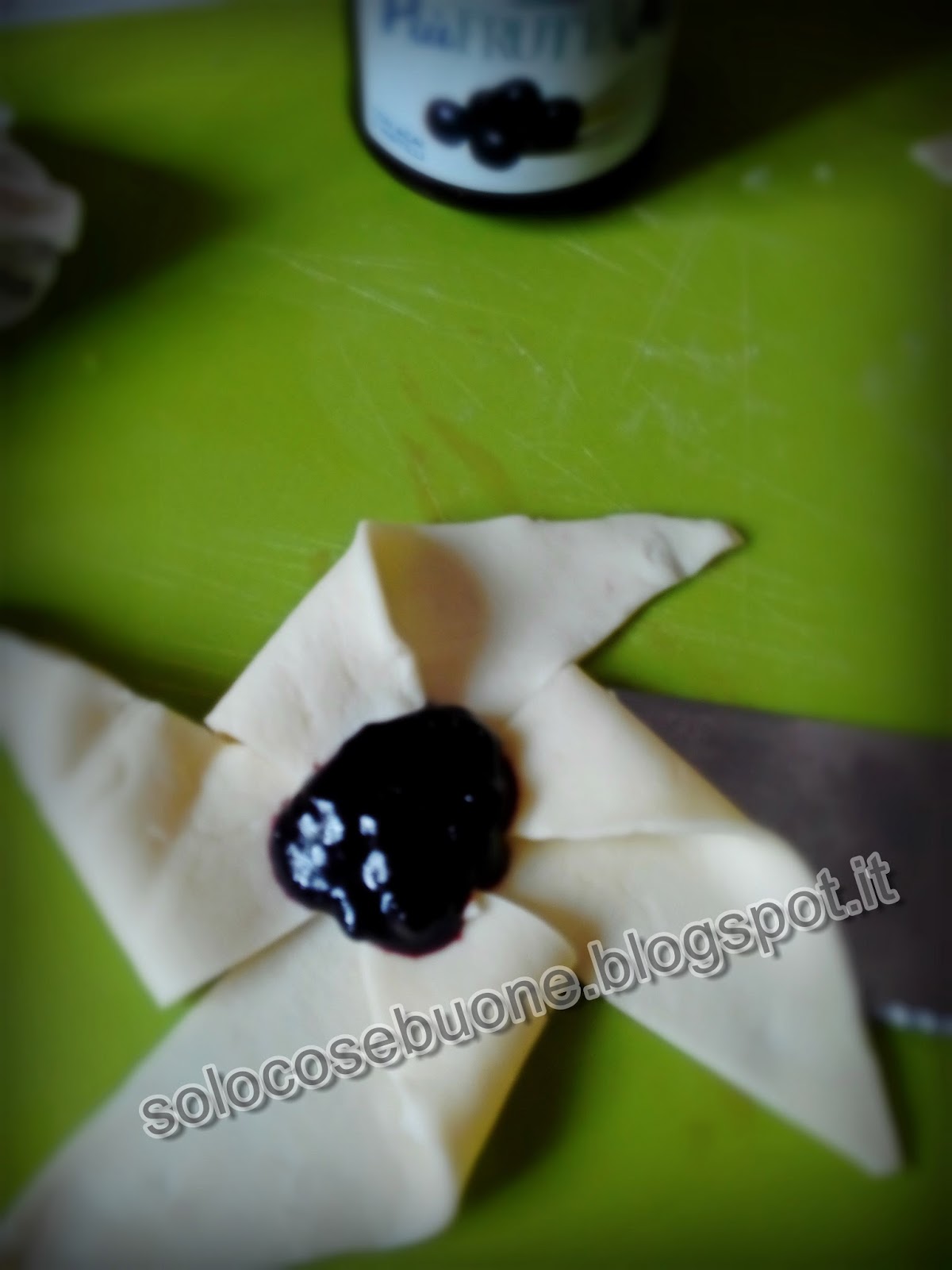 Al centro mettiamo un cucchiaio di confettura e portiamo verso il centro la cornice di pasta .