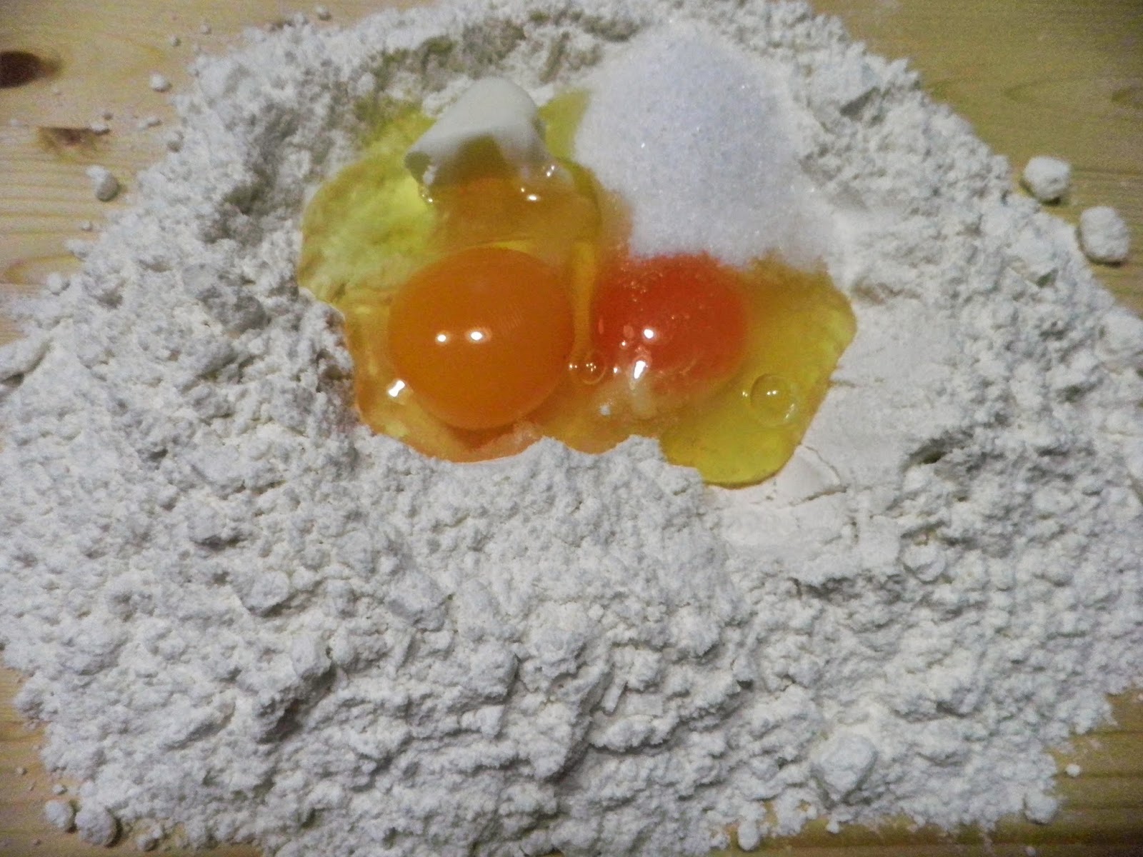Ingredienti per la pasta: 300 g di farina 00, due uova, un cucchiaio di zucchero, un pizzico di sale, una noce di strutto, vino bianco quanto basta.