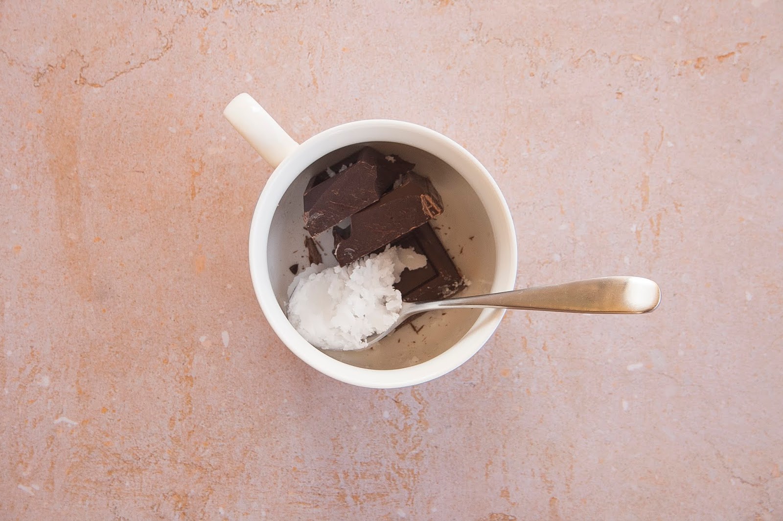Spezzettate il cioccolato fondente extra e fatelo sciogliere al microonde o a bagnomaria con 2 cucchiai di olio di cocco all’interno di un contenitore resistente al calore.