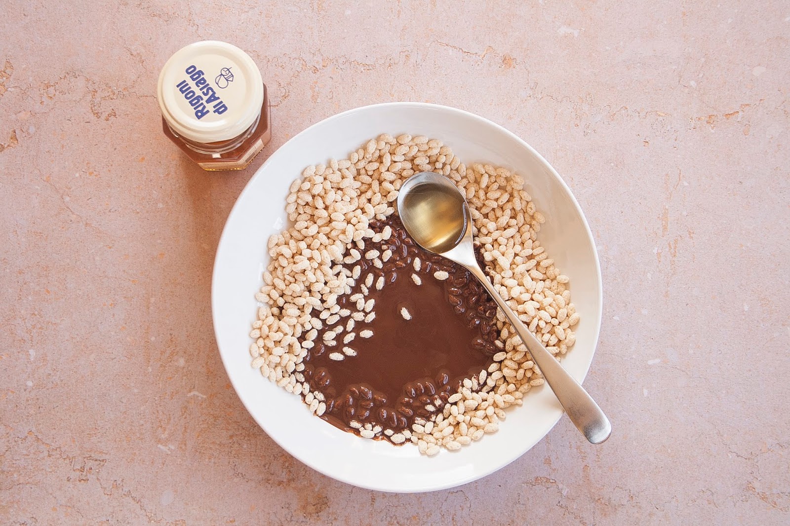 Quando il cioccolato si sarà completamente sciolto, versatelo in una ciotola in cui avrete aggiunto il riso soffiato e 2 cucchiai di miele.
