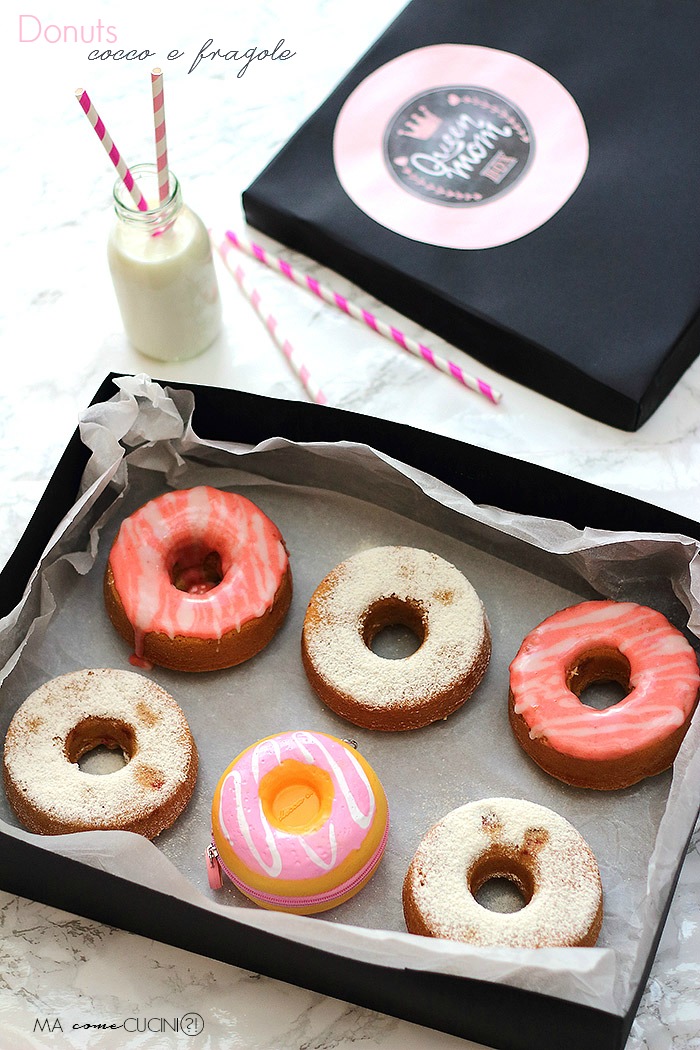 donuts preparati da mia sorella per Re-cake, ho semplicemente eliminato le spezie, sostituito parte della farina con la farina di cocco e lo yogurt bianco con quello al cocco, ho inoltre aggiunto dei pezzi di fragola.