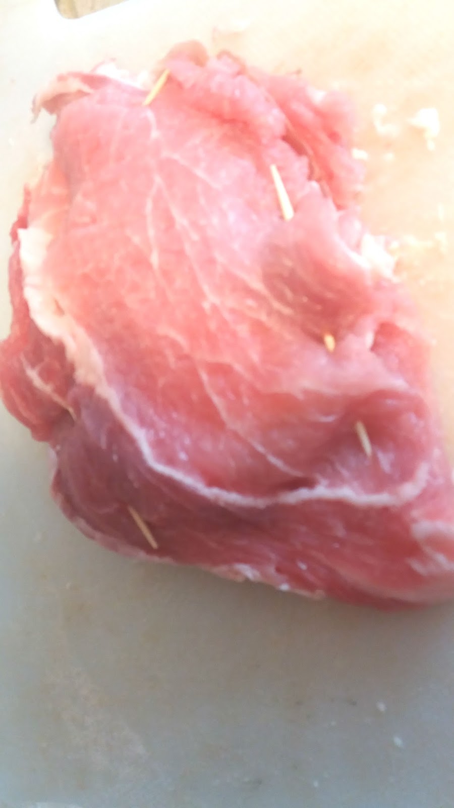 Farcire 2 a 2 le fette di arista con provola e pancetta,chiudere con stuzzicadenti