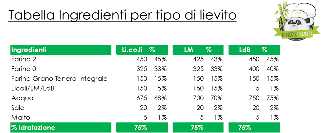 Prima cosa da tenere a mente: l’impiego di diversi tipi di lievito (per mantenere lo stesso livello di indratazione) porta a calibrare diversamente gli ingredienti. Nella tabella vedete 3 esempi: Li.co.li (1:1 farina/acqua), Lievito Madre (2:1 farina/acqua) e Lievito di Birra che è secco.