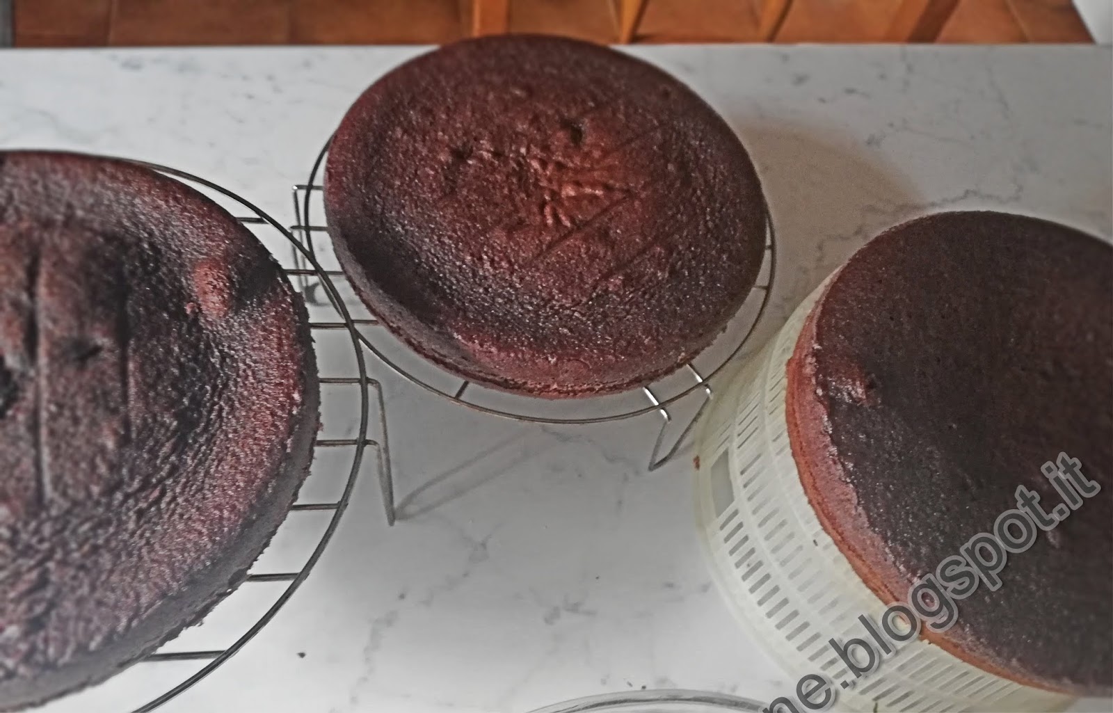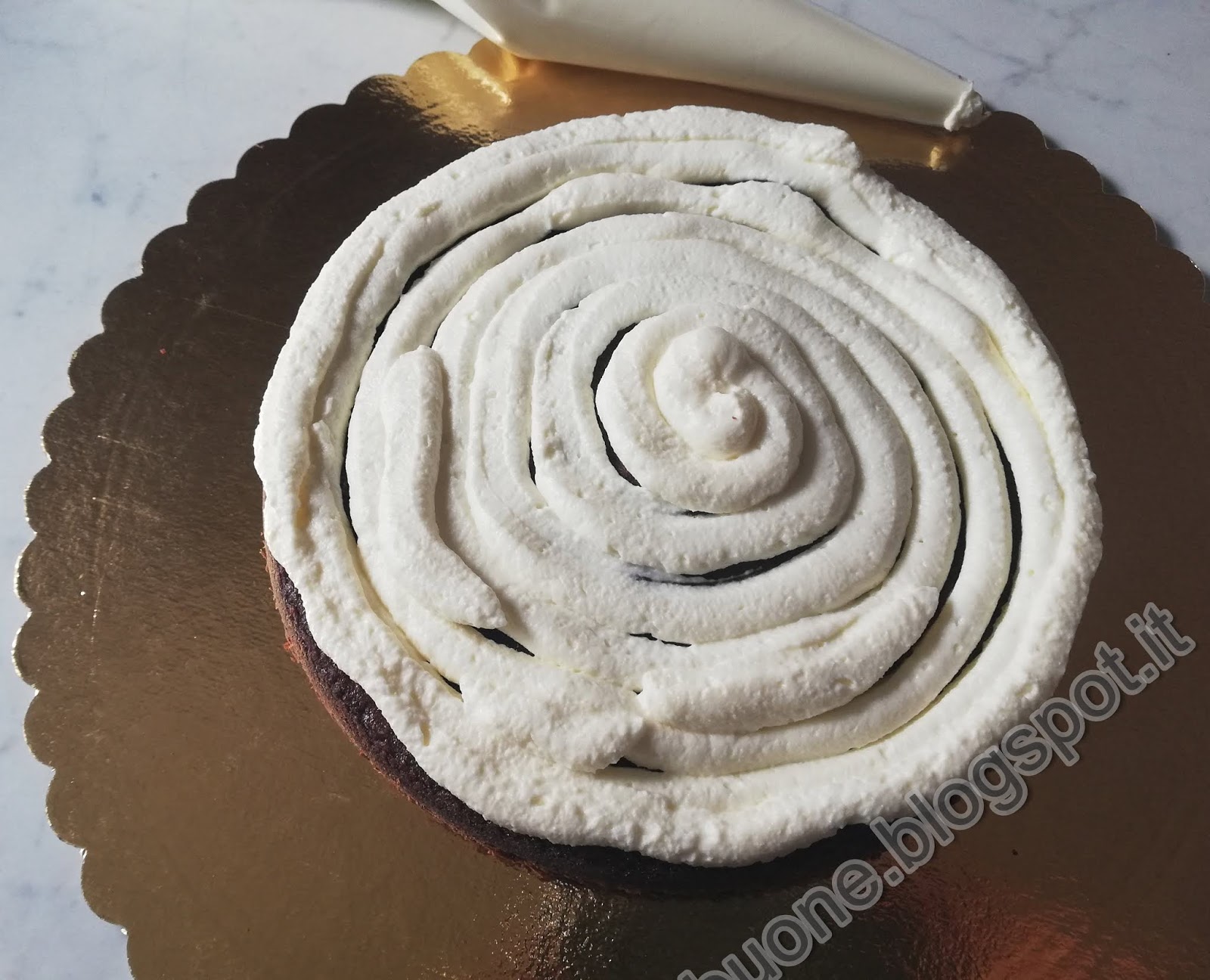 Appoggiate il primo disco di torta direttamente sul piatto da portata e farcitelo con una spirale di crema (come vedete nella foto ), poi un disco di torta e poi la crema, poi un altro disco torta e poi la crema, fino a completare con l’ultimo disco di torta.