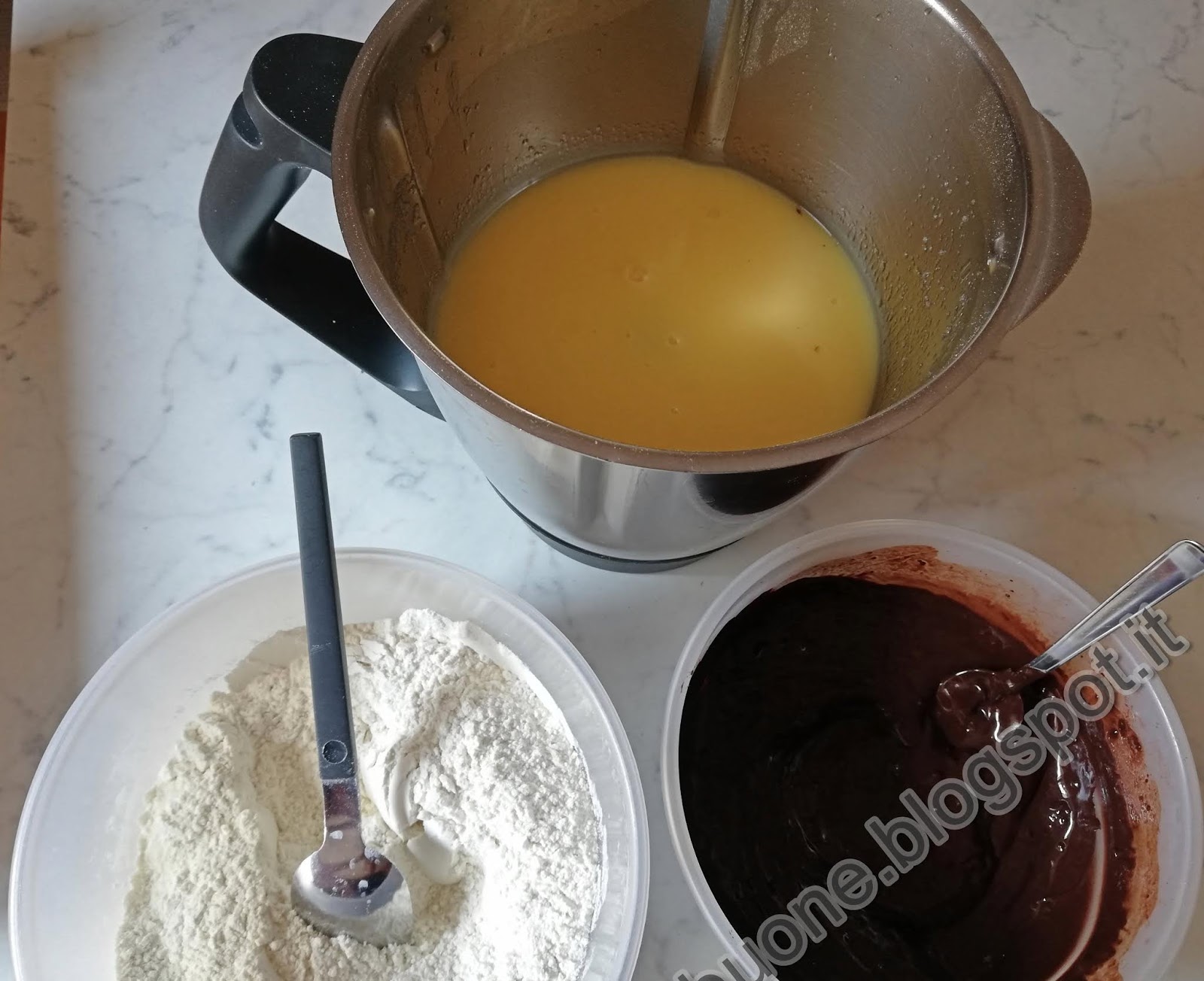 A questo punto aggiungete il mix di farina , lievito e bicarbonato, e mescolate fino a che tutta la farina sarà ben incorporata, quindi aggiungete il mix di acqua e cacao. e mescolate per 1 minuto.