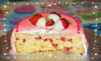 Ricoprire con altro strato di crema e fragole e concludere la torta col terzo ed ultimo disco di pan di Spagna che andrà anch’esso irrorato con la bagna ma leggermente.