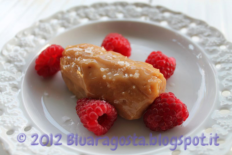 Una volta freddo ho preso una cucchiaiata e l’ho messa su un foglio di carta forno per cercare di modellarla come fosse un parallelepipedo…. impresa non facile, ma sono riuscita a darle una sua parvenza di forma. Diciamo anche che non c’è bisogno che abbia una forma regolarissima, data la consistenza morbida è alquanto difficile. L’ho messa su un piattino, sembrava quasi una caramella mou, una spolverata di sale Maldon e i miei lamponi intorno. Giuro non ci sono parole!!!