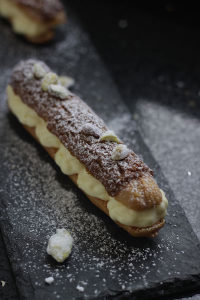 Tagliare l’eclair e farcirla con la crema chantilly. Richiudere e cospargere coi pistacchi e la polvere.