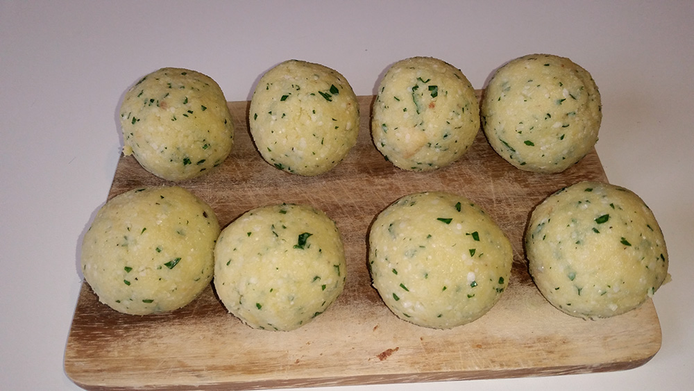 Combine everything and place in the fridge to rest for 10/15 minutes. If the eggs you are using are big, it may be that the dough would result too soft. In that case, make a test: if you can roll a ball, it’s ok, otherwise add some bread. Viceversa, if the dough is too firm to be manipulated, add an egg or a bit of milk. After the rest, shape the balls with the hands: we did 8 mid-size balls, but you can make 4 big balls or 16 small ones.