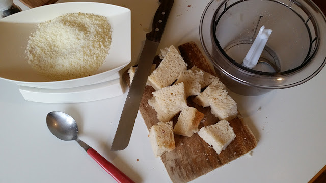 While the sauce goes on cooking, make the cheese balls. Finely grate the cheeses, and dice the bread. Take a large bowl and place into it: grated cheeses, bread, chopped parsley and chopped or squeezed clove of garlic. Do not add salt: cheese will give the right saltiness to the pallotte.