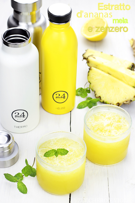 A questo punto ero attrezzatissima per affrontare al meglio le mie giornate al mare! mancava solo la ricetta giusta per riempire a dovere i miei nuovi fantastici acquisti, e l’ananas mi è sembrato subito perfetto. A parte che è giallo d’accordo, ma vi viene in mente qualcosa di più sano, fresco e dissetante sotto il sole di un delizioso estratto d’ananas? Ci ho aggiunto della mela verde e un po’ di succo fresco di zenzero, per dare al tutto una sferzata d’energia, tanto ghiaccio tritato e la bibita da spiaggia più dissetante e salutare che possa venirvi in mente è pronta, io potrei berne dei litri!
