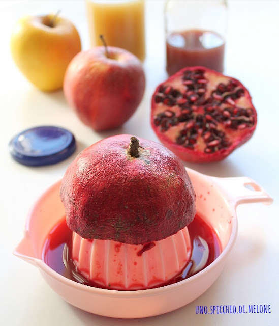 Se decidete di estrarre anche il melograno allora sgranatelo; in alternativa (io preferisco fare così) tagliate il melograno a metà e spremetelo nel spremi agrumi.