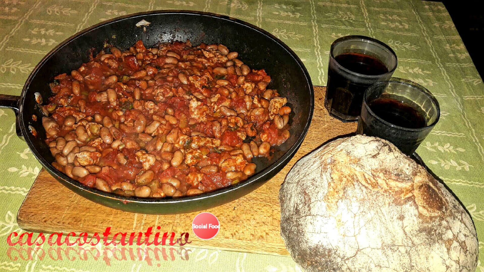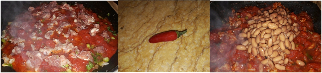 Ed ecco che infine ci tocca eseguire il gesto che ci fa immergere nel vecchio West e ci fa ritrovare con la nostra immaginazione tra i canyon dell’Arizona, subito dopo essere scampati ad un’imboscata dei nativi americani tra le strette gole di un fiume ormai prosciugato: apriamo la nostra latta di fagioli borlotti già lessati, la scoliamo completamente e ne riversiamo il contenuto residuo nella nostra padellona. Certo avremmo potuto acquistare dei fagioli da mettere in acqua la sera prima per poi cuocerli al momento ma, mia opinione personale, sono ragionevolmente sicuro che non fosse questo il metodo maggiormente in uso all’epoca. Quindi vada per la latta di fagioli lessati. Continuiamo a girare il tutto con il nostro fido cucchiaio in legno e alla fine avremo qualcosa di molto simile al nostro piatto finito. Ovviamente più cuocerà, più il “sughetto” si restringerà e meno possibilità avremo di fare le nostre vorticose scarpette di pane. Quindi diciamo che non appena la consistenza raggiunta sarà quella desiderata, non appena gli ingredienti saranno tutti ben amalgamati e cotti, ecco che potremo spegnere il fuoco e goderci il frutto del nostro lavoro culinario.