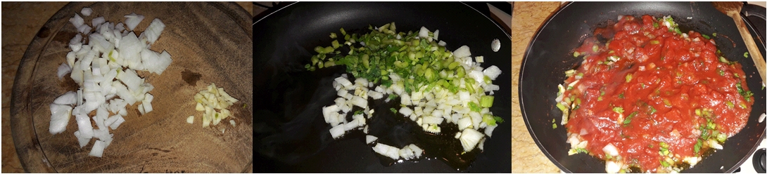 Il tempo di mettere su la padella e iniziate a tagliare a piccoli pezzi un po’ di sedano da inserire altresì nel soffritto. Ricordate che il sedano non perde di consistenza, quindi tagliatelo delle dimensioni che poi ritroverete effettivamente nella pietanza finale: il sedano non si “scioglie” e dà anche consistenza al boccone. A questo punto, quando la cipolla si sarà imbiondita, mettete una generosa quantità di polpa di pomodoro. Capisco che anche in questa circostanza la questione sia soggettiva, personalmente ho inserito la quantità di un’intera “lattina” di polpa.
