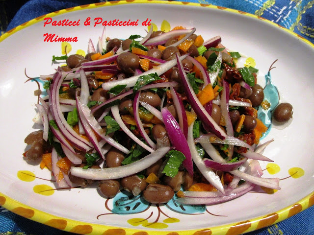 Li ho lessati come faccio abitualmente e quindi aggiungendo carote, sedano, cipolla e la foglia d’alloro. A cottura ultimata li ho scolati e ho aggiunto carotine novelle a pezzetti, cipolla rossa di Tropea, sedano, pomodori secchi sott’olio e un ciuffetto di finocchietto selvatico crudo che ha conferito un profumo inebriante a questo piatto. Tutto irrorato da un ottimo olio extravergine d’oliva.