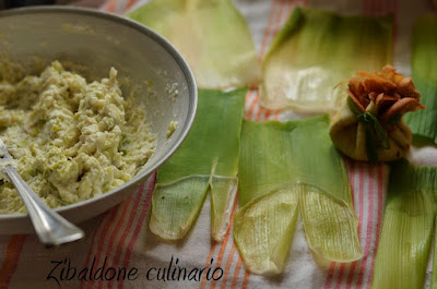 In una ciotola preparare la farcia, miscelando la ricotta con il formaggio, sale, pepe e i porri rosolati.