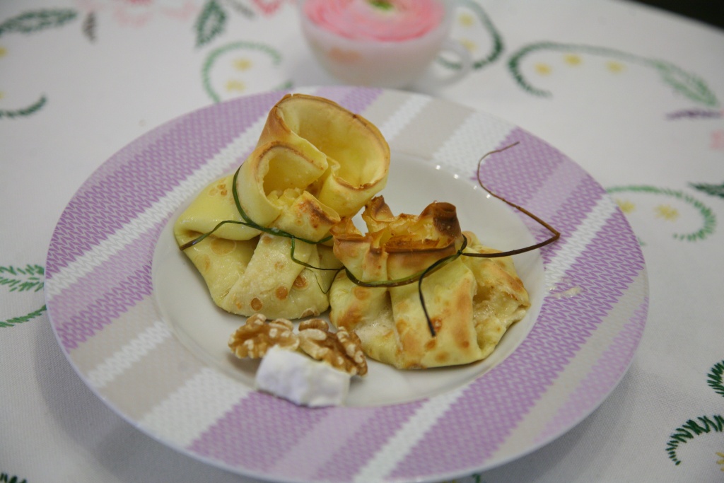 Prendere le crespelle e mettere al centro un po’ di ripieno, richiuderla a fagottino e legarla con un filo di erba cipollina.