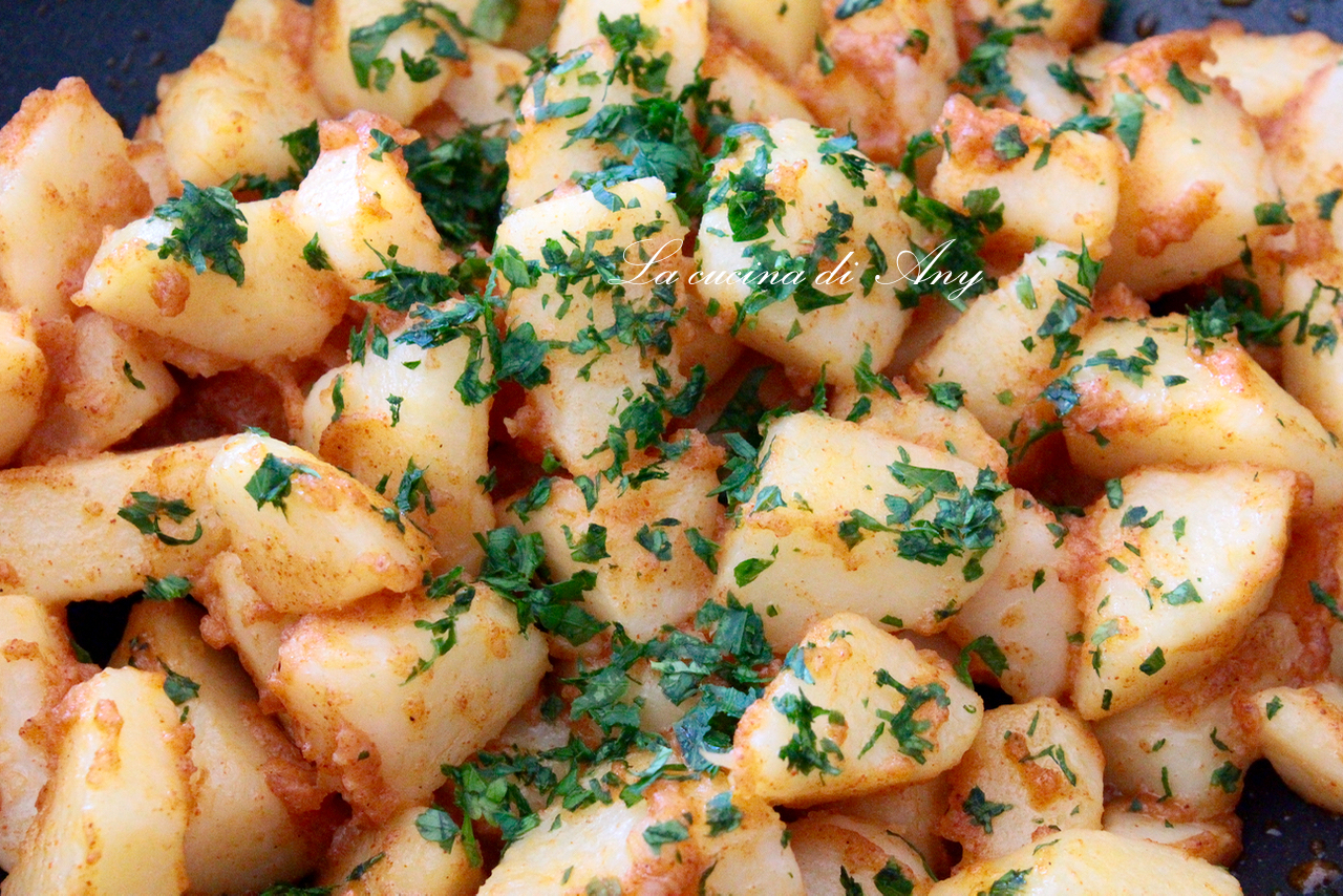 Se pun cateva linguri de ulei extravirgin de masline intr-o tigaie impreuna cu paprika dolce, se amesteca si se incalzeste putin pe foc. Se adauga cartofii fierti, se amesteca, se pune deasupra patrunjel tocat si apoi se servesc calzi.