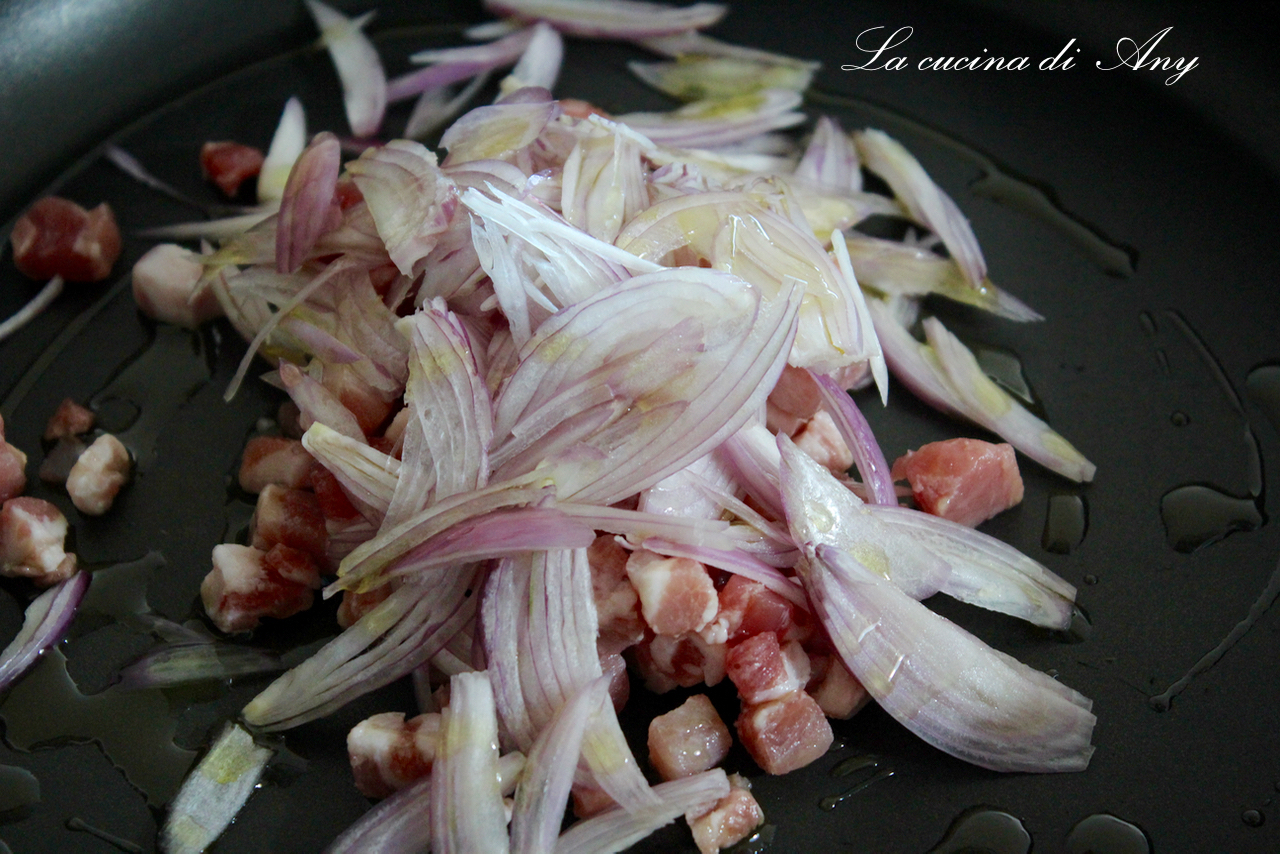 Tagliare i scalogni a julienne e rosolarli in una padella con la pancetta a dadini e qualche cucchiaio di olio extravergine di oliva.