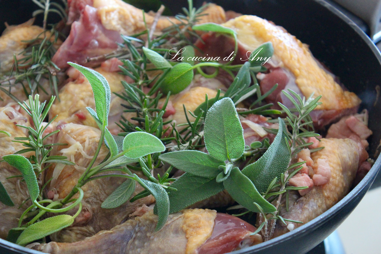 Aggiungere la faraona a pezzi, il rosmarino, la salvia, il sale, il pepe.