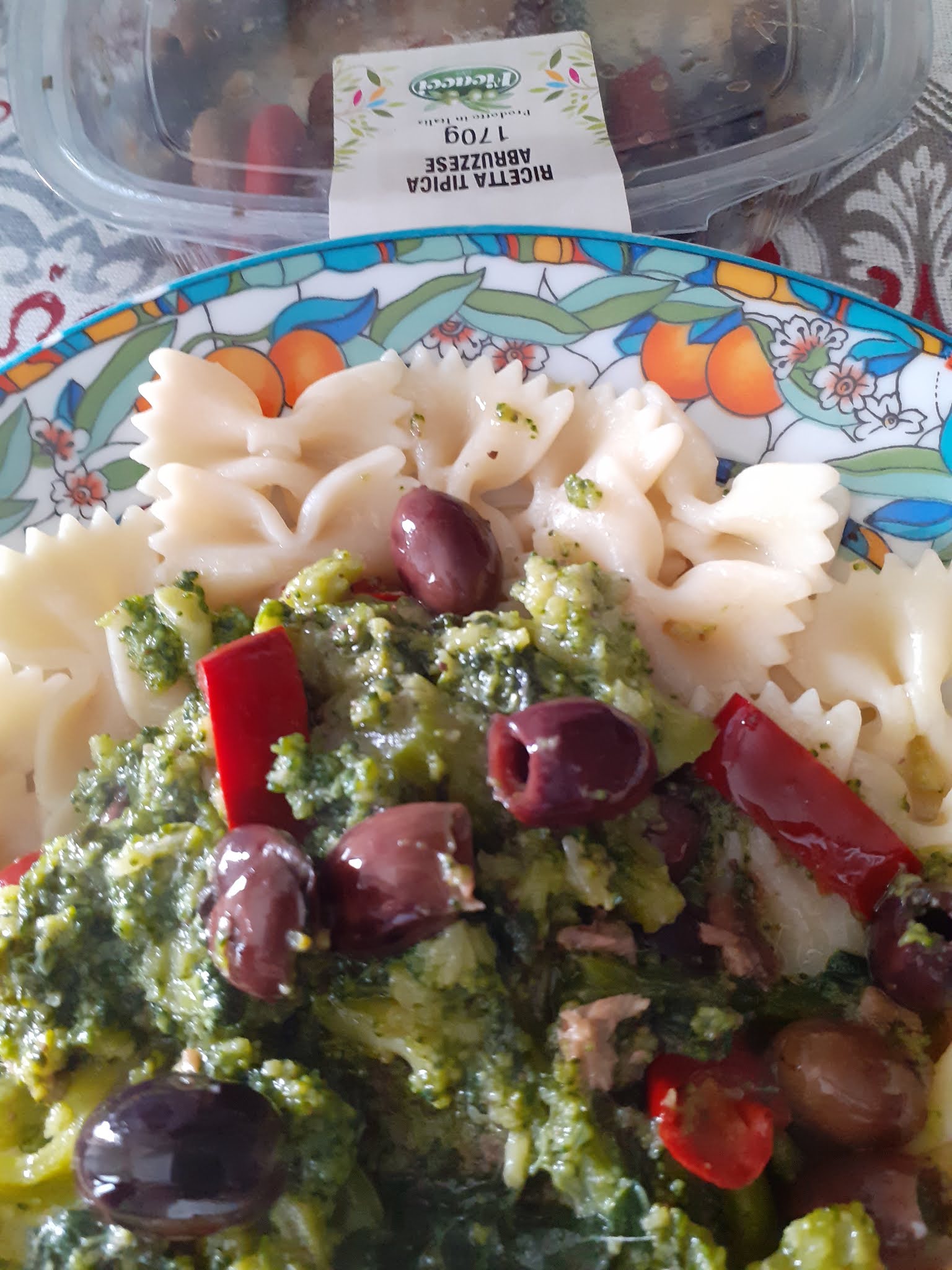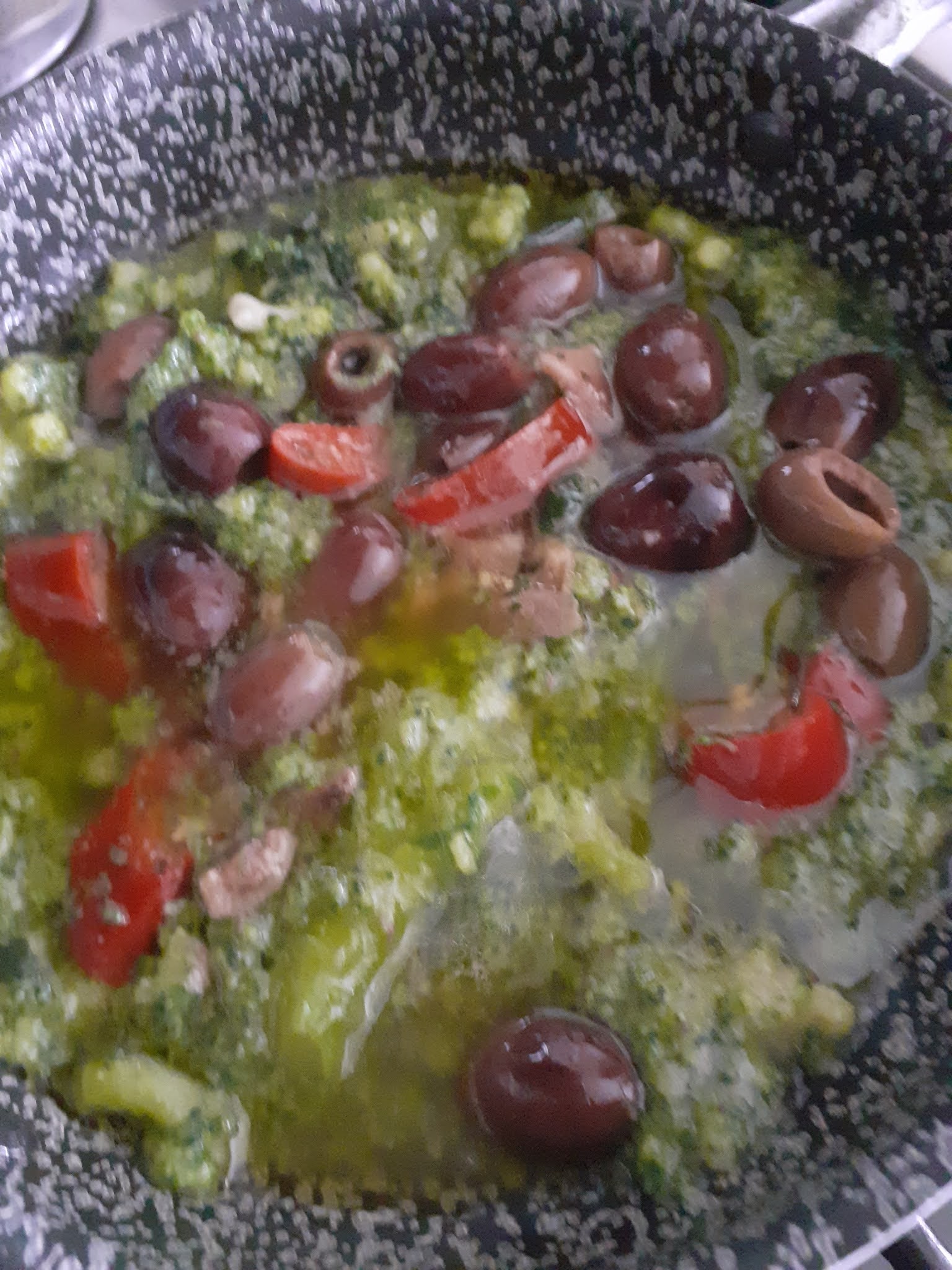 In una casseruola,olio e aglio ad imbiondire,aggiungere i broccoli ,il sale,coprire e lasciarlo appassire ,unire le olive ed insaporire qualche minuto.Intanto cotta la pasta la scoliamo e condiamo con il sugo cremoso!