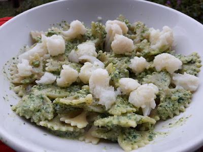 Quando le farfalle sono al dente, scolarle insieme al cavolfiore e condire entrambi con il pesto di prezzemolo. Servire con parmigiano a piacere.