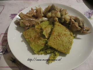 Nel frattempo tagliare i carciofi eliminando le parti più dure e tagliarle in spicchietti, coprirle di acqua e succo di un limone e dopo mezz’ora scottarli con tutta l’acqua e limone, quando bolle l’acqua spegnere il fuoco e tenere da parte i carciofi. Sbucciare e tagliare in quadretti le patate e farle scottare in padella con un filo d’olio, aggiungere tanta acqua da coprirle e farle cuocere. Quando saranno quasi pronte aggiungere i carciofi e far cuocere ancora qualche minuto, aggiungere sale ed olio e mescolare bene. Nel frattempo su una teglia con cartaforno versare un filo d’olio e la pastella di piselli, mescolare delicatamente l’olio e cuocere a 220° per 30 minuti.