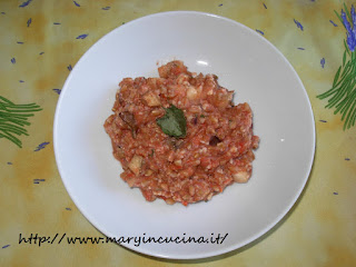 140 gr farro integrale, 6 pomodori, 1 melanzana grossa, 50 gr noci del brasile, basilico, sale integrale, cipolla rossa.
