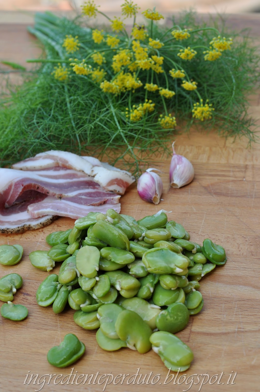 Tritare finemente aglio e finocchio, in una padella con l’olio mettere il trito la pancetta a dadini e le fave e salare.