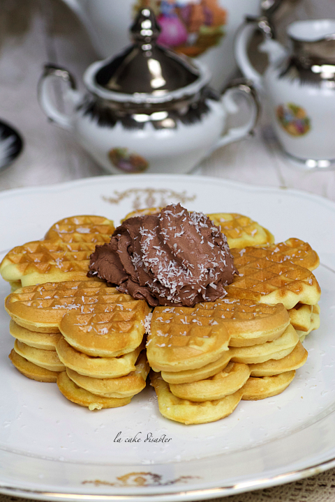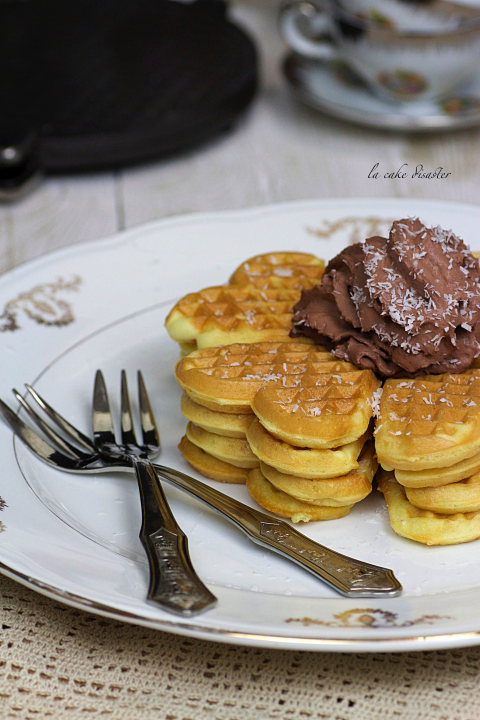 La preparazione di queste ferratelle è semplicissima. Mettere tutti gli ingredienti insieme in una ciotola capiente e con l’aiuto di una frustina elettrica (io ho usato la planetaria) mescolare bene il tutto fino a che il composto non risulti bello liscio. A questo punto con un cucchiaio oppure con un mestolo piccolo, prendere un po’ del composto e metterlo sulla piastra, farlo cuocere per 4 minuti. Potete servire le ferratelle con una spolverata di zucchero a velo, oppure con della confettura a piacere o del cioccolato, io ho servito questi dolcetti con della panna al cioccolato con una spolverata di scaglie di cocco.