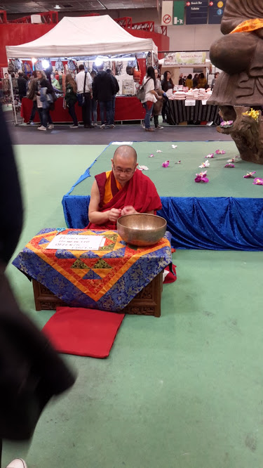 Il monaco buddista con grande dignità offre braccialetti che cinge al polso di chi è interessato a fronte di una piccola offerta libera..