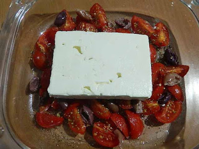 Infornare la Feta con Pomodorini a 180° per 15 minuti poi accendere il grill per 5 minuti.