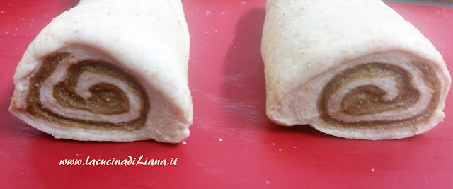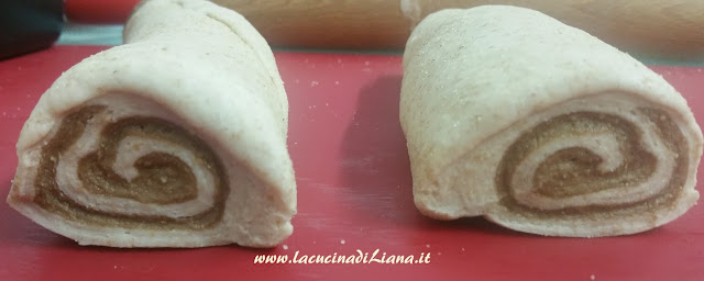 Stendere col mattarello su un piano infarinato i 2 impasti in 2 rettangoli. Porre l’impasto scuro sopra quello chiaro, quindi avvolgere stretto l’mpasto a formare un cilindro.
