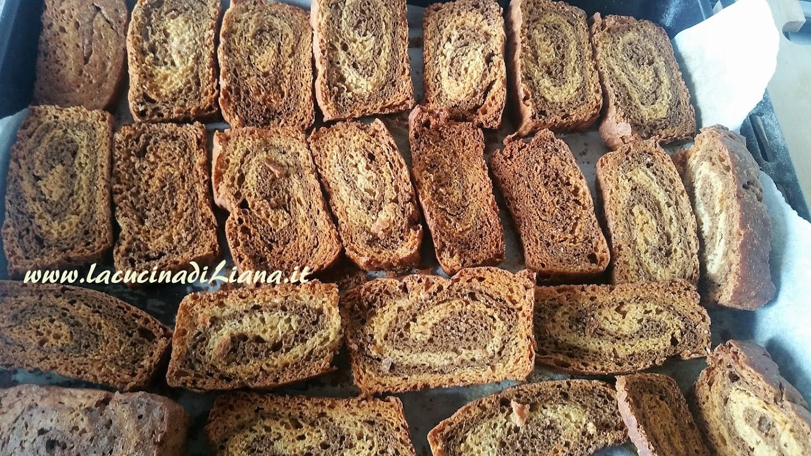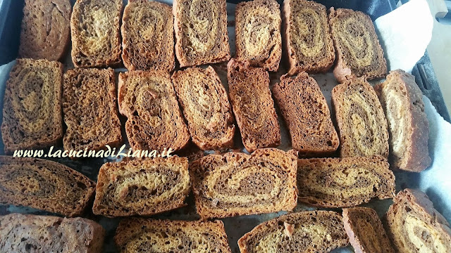 Disporre le fette sulla leccarda rivestita di carta forno e tostare le fette nel forno a 180° per 30 minuti girandole dopo i primi 15 minuti. Abbassare la temperatura a 150 gradi e proseguire la tostatura per altri 30 minuti lasciando lo sportello del forno aperto interponendo un cucchiaio alla chiusura.
