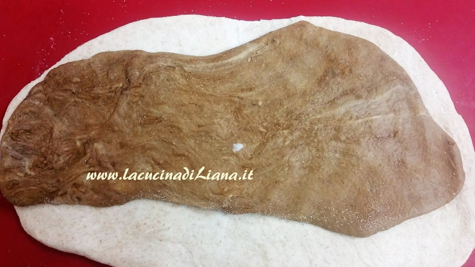 Stendere col mattarello su un piano infarinato i 2 impasti in 2 rettangoli. Porre l’impasto scuro sopra quello chiaro, quindi avvolgere stretto l’mpasto a formare un cilindro.