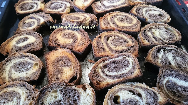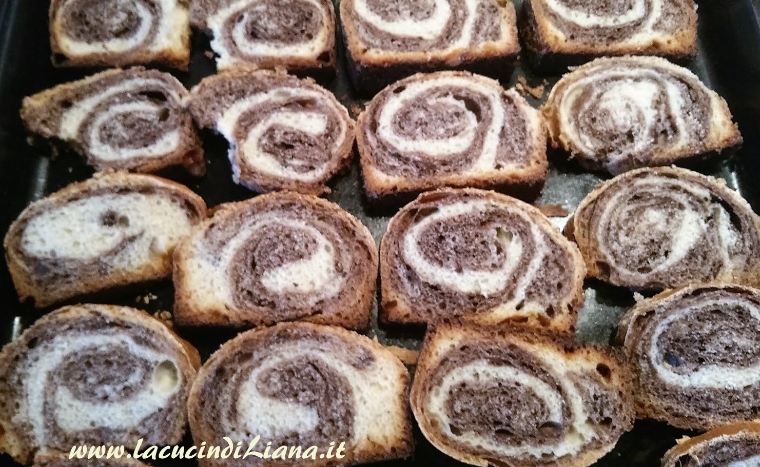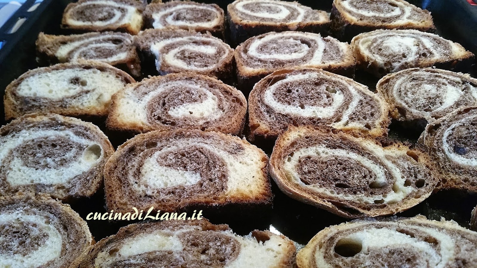 In questa nuova versione, tratta da una blogger in cucina le fette sono con la classica spirale bicolore, grazie alla sovrapposizione di due impasti, uno bianco e uno nero al cacao, che vengono arrotolati insieme.