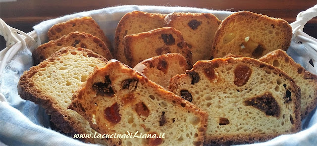 Fette biscottate con frutta secca, io ho scelto fichi secchi e albicocche disidratate, ma si possono fare con uvetta, o mirtilli, o la frutta secca che preferite.