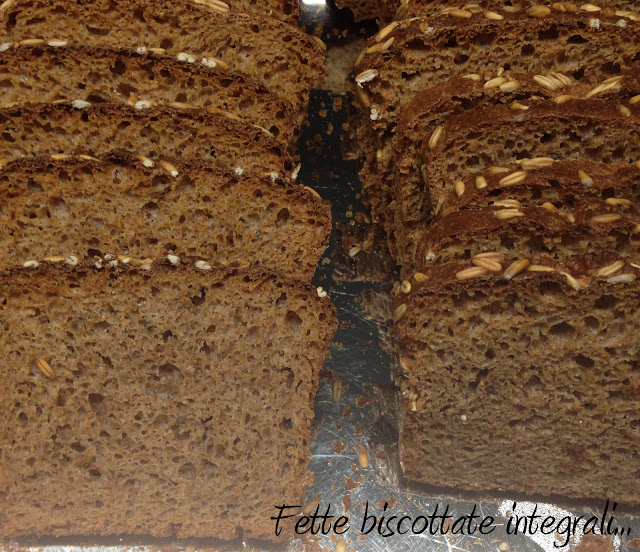 Pane, pane, fortissimamente pane…in ogni forma. Dopo aver raggiunto una discreta confidenza con il pane per tutti i giorni, mi sono voluto avventurare nelle fette biscottate. Sono partito da una ricetta del mio amico Piero, e dopo un paio di prove, ho fatto dei piccoli aggiustamenti di gusto e di esigenze domestiche: 100% integrale e poco zucchero (moglie dixit). In primis ero un pò scettico, perché non mi ero mai cimentato con solo farine integrali; poi, però, l’ho presa come una sfida e, devo ammettere che si può fare, con delle piccole accortezze. Ora vi dico tutto…intanto ecco il risultato