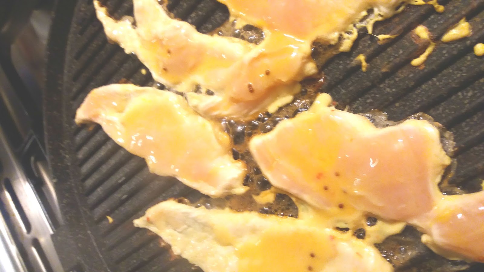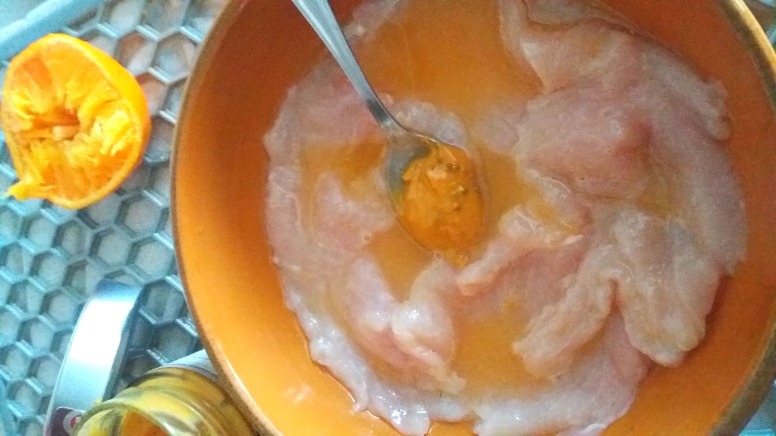 In una ciotola ,fetine di pollo,succo di arancia ,sale e senape,mescolare il tutto e lasciare