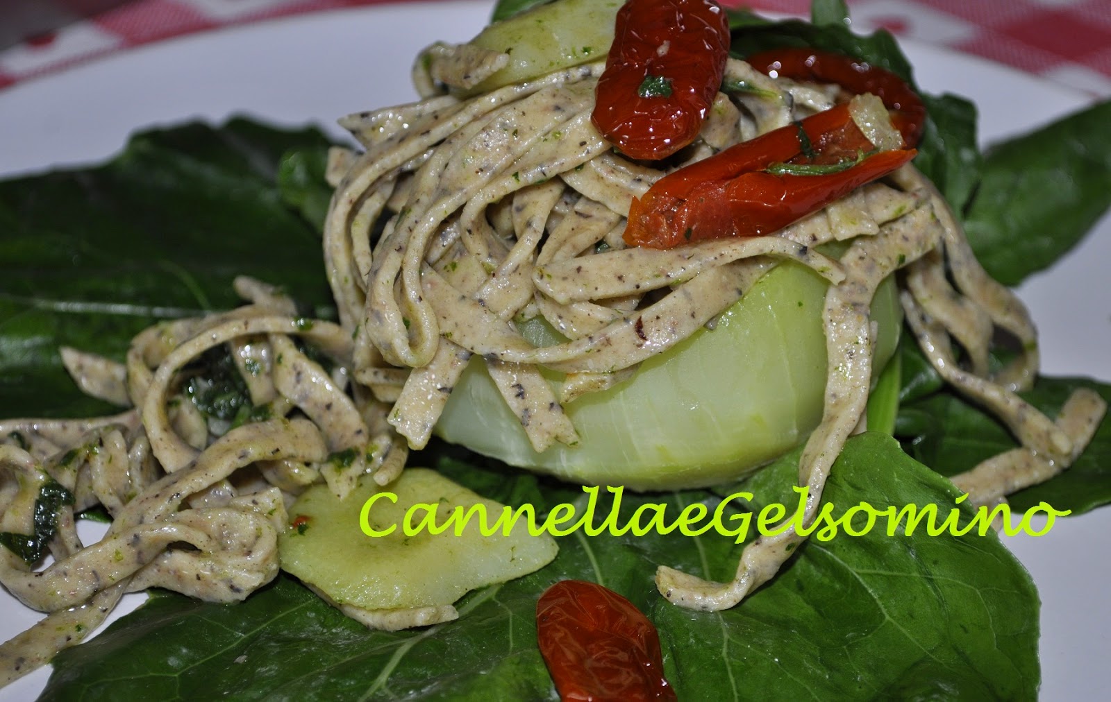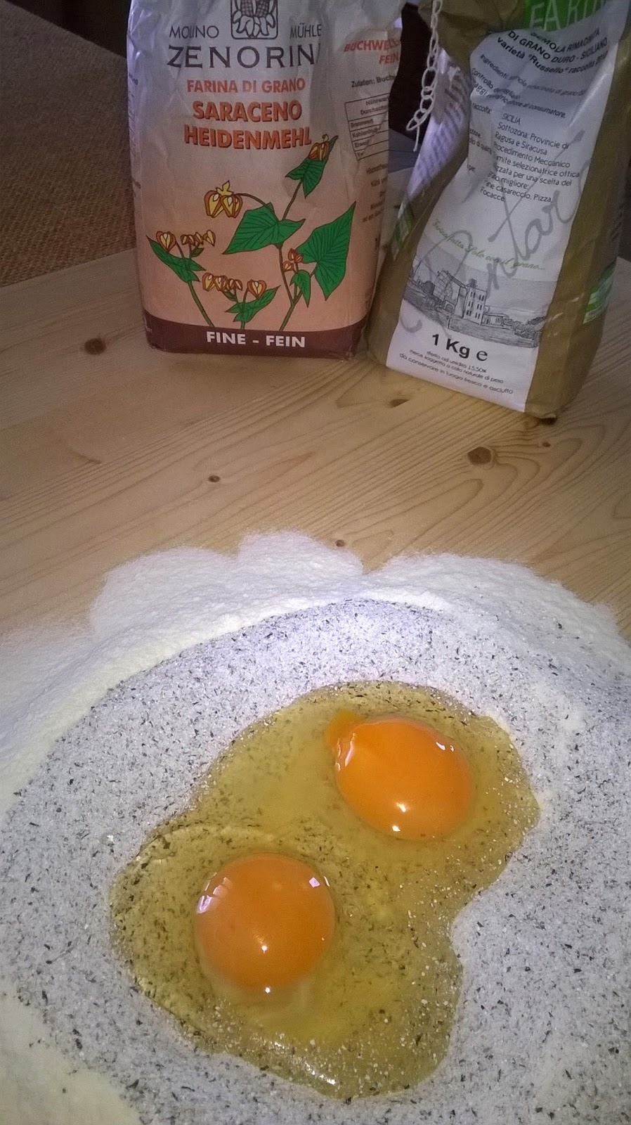 Preparare la pasta impastando 100 g di farina di grano saraceno con 100 g di semola di grano duro (ho usato quella rimacinata di grano Russello che è una antica varietà del mio territorio) con 2 uova (dose sufficiente per 4 persone).