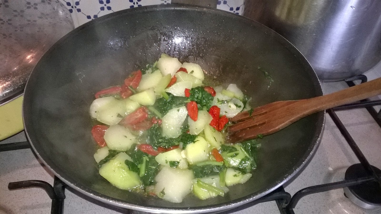 Soffriggere in olio extravergine d’oliva (io ho usato quello DOP dei Monti Iblei) due spicchi d’aglio e dei pomodorini secchi (io preferisco quelli datterini di Scicli).