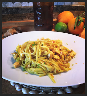 Scolare la pasta al dente e terminare la cottura nella padella del salmone, aggiungendo la crema di agrumi precedentemente preparata.