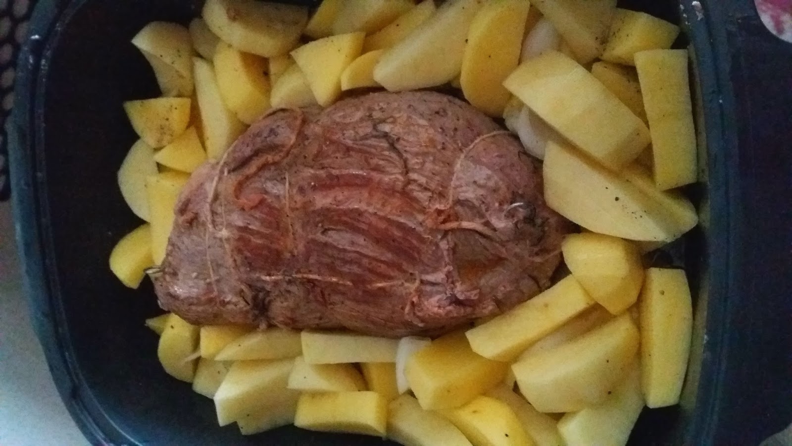 (adatta al forno),aggiungere patate ,sale,pepe, rosmarino,cipolla affettata , olio ed 1 bicchiere  di vino.